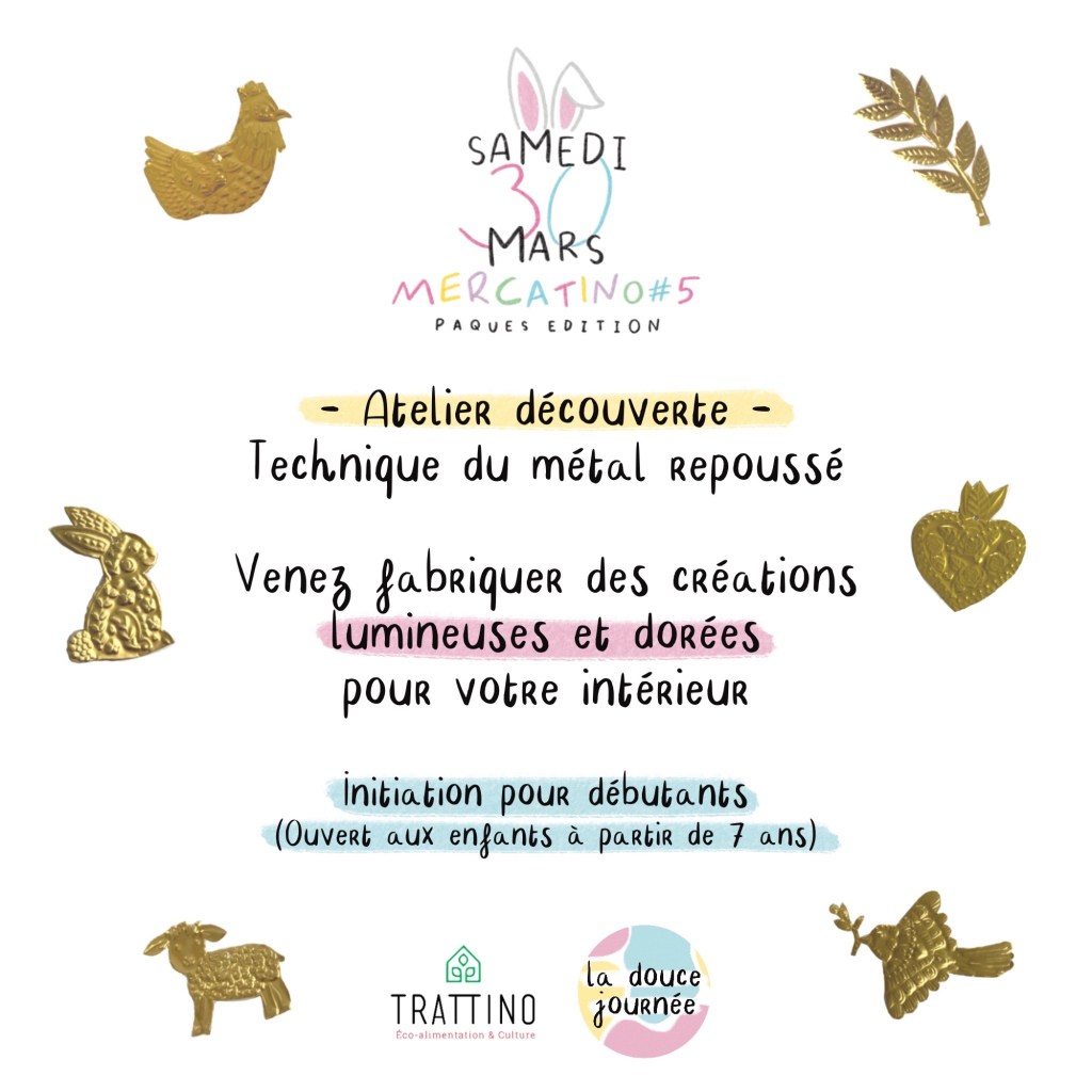 Organisation d’un atelier pour débutants, initiation à la technique du métal repoussé lors du Mercatino de Pâques chez Trattino, un tiers-lieu éco responsable à Lyon.