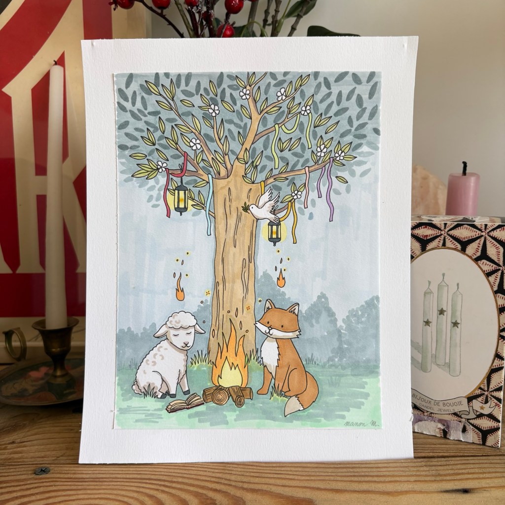 Série d’illustrations en techniques traditionnelles sur les thèmes du printemps, des fêtes de la foi, et des animaux.